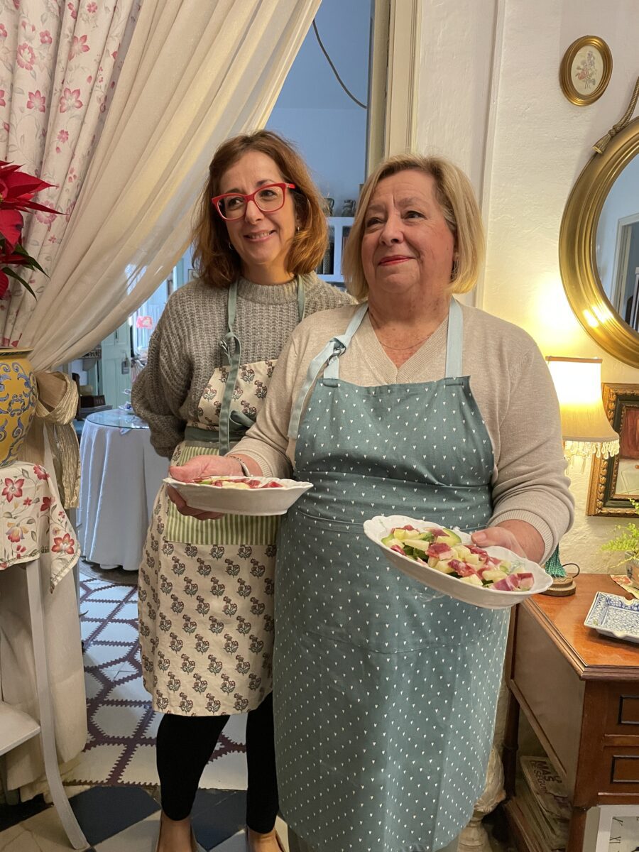 Raquel en Maria-Pepa staan ons als volleerde gastvrouwen al op te wachten. Ze zijn een beetje zenuwachtig, want we zijn hun eerste Sazón-boeking. Maar Maria-Pepa weet hoe ze gasten moet in- en aanpakken. Ze baatte hier jarenlang een toeristisch gastenverblijf uit, want het domein is groot genoeg om vijf families te slapen te leggen. Nu hebben de kinderen en kleinkinderen van Mari-Peppa er hun intrek genomen. Raquel is de oudste dochter en grafisch ontwerper. Ze geeft in deze cortijo ook workshops scrub. Dat blijkt een soort fotoboek te zijn, leer ik later tijdens het gesprek aan tafel. Die tafel staat al prachtig gedekt.