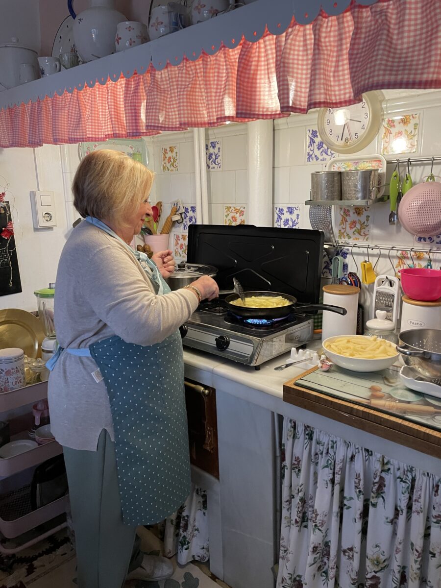 Er staat een bordje met ibericoham, avocado en kaas klaar. En in een grote soepkom heeft Maria-Pepa haar ajoblanco al uitgegoten. Het concept is natuurlijk dat je streekgerechten krijgt opgediend die van generatie op generatie zijn doorgegeven. Maar het meest trots is Maria-Pepa op de rabo de toro (ossenstaart) die ze zal bereiden. Elke streek heeft zijn eigen recept, maar Maria-Pepa gaat er prat op dat ze aan deze klassieker geheel haar eigen draai heeft gegeven. We mogen zelfs even in haar keuken kijken. De pot staat nog op het vuur te pruttelen in een groentenweelde van erwtjes en wortelen. Ze waarschuwt ons dat we nog een gaatje moeten vrijhouden voor de flan caramel. Ook huisgemaakt. En die blijkt bijna zo groot te zijn als de kerststal.