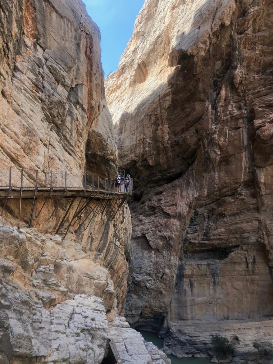 Maar inmiddels weet ik hoe veilig de Caminito is. Het oorspronkelijke pad werd gebouwd tussen 1901 en 1905 voor arbeiders van een nabijgelegen waterkrachtcentrale. In 1921 opende koning Alfonso XIII het traject om de inauguratie van de nabijgelegen dam bij te wonen, vandaar de naam ‘Het Koningspad’. Het verhaal gaat dat toen hij het pad zag, besloot om het niet te lopen. Hoogtevrees? Na jarenlang verval en gevaarlijke situaties werd het pad in 2015 volledig gerestaureerd en heropend. Tegenwoordig is het stevig beveiligd, goed onderhouden en alleen toegankelijk voor bezoekers met een ticket en helm.