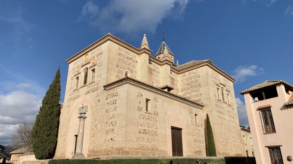 De Koninklijke Moskee van het Alhambra werd gebouwd in 1308 tijdens het bewind van Mohammed III, maar nadat de christenen naar Granada in Andalusië, Spanje kwamen, werd Iglesia del Santa Maria de la Alhambra gebouwd. Gestart in 1581, voltooid in 1618. Het is geen indrukwekkende kerk, maar de plek in het hart van de medina zorgt er toch voor dat je ‘m even gaat bezichtigen. Voor de kerk staat een marmeren pilaar met op een plaquette het verhaal van twee monniken die het Moorse koninkrijk binnenkwamen om hun geloof aan de ketters te prediken. Ze werden op deze plek onthoofd door de sultan Mohammed V. Je voelt hier gewoon de brute historie van zowel de Moorse als de katholieke overheersers.