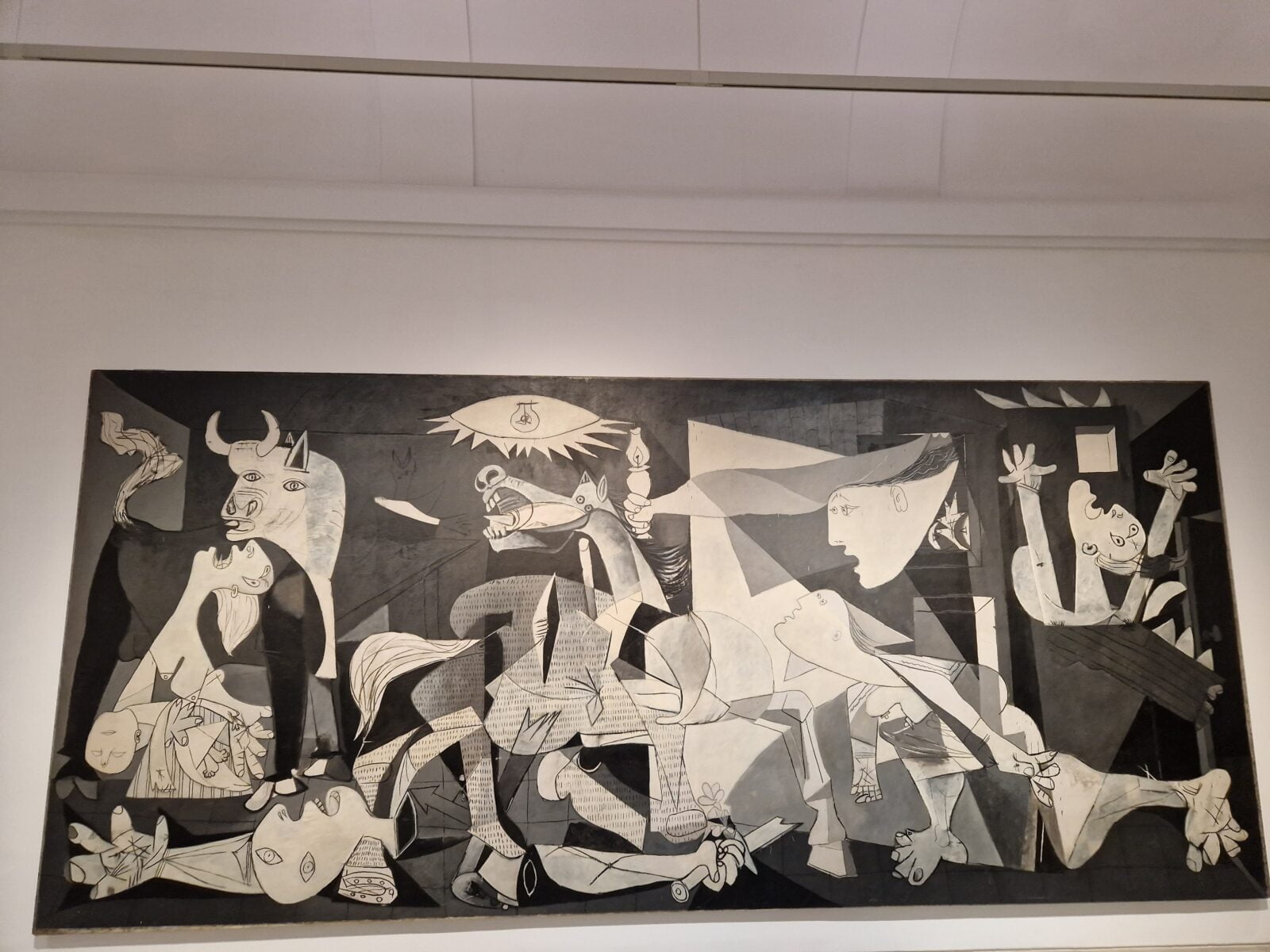 We beginnen in het museum Reina Sofia om de Guernica van Picasso te zien. Geschilderd in 1937, in opdracht van de revolutionaire regering (die vocht tegen Franco) voor de wereldtentoonstelling in Parijs. Het is een indrukwekkend schilderij, groot, donker en dreigend, je ziet en voelt de verschrikking van een bombardement op klaarlichte dag, op een drukke markt.