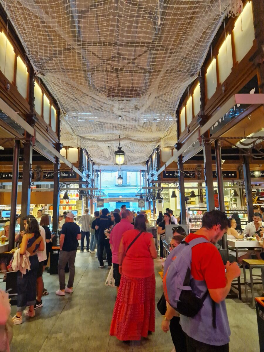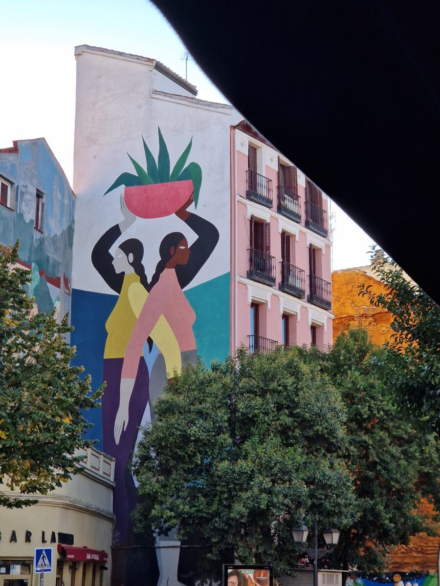 We bekijken het immense Plaza Mayor en de erg toeristische markt San Miguel, waar alleen (prachtige maar wel hele dure) tapas te koop zijn. We lopen heel wat kilometers, in wandeltempo zie je het meest. Zoals deze prachtige muurschildering. Het is nog echt warm dus regelmatig pauzeren we op een terras met een cortado of een drankje met tapas.