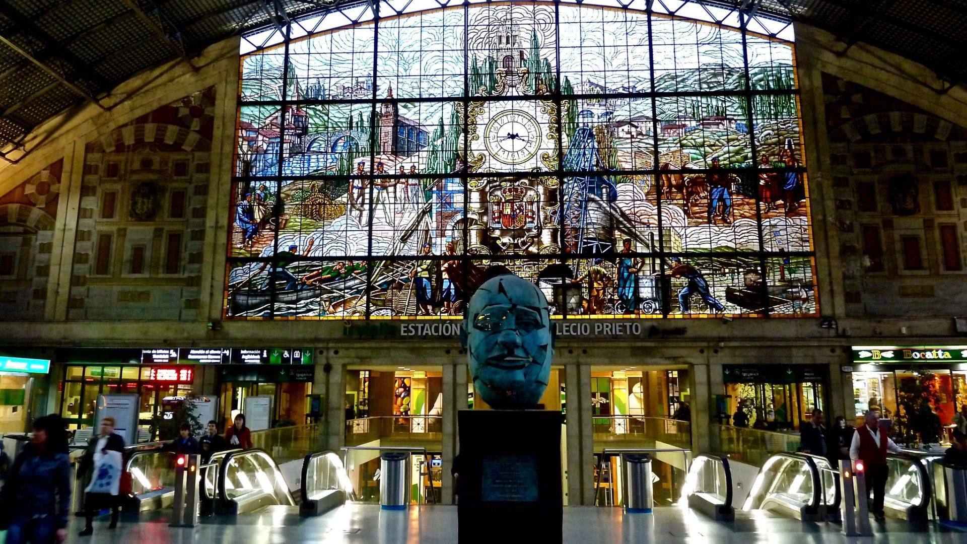 Het glas-in-lood vertegenwoordigt het leven en de gewoonten van de stad, zoals de Basiliek van Begoña, de San Antón-brug, de staalindustrie, de visserij, de sport. Ook zie je een klok met daaronder een schild van Spanje. Dat deel is geretoucheerd in de jaren ‘80, aangezien het originele schild werd gebruikt tijdens de dictatuur van Franco.