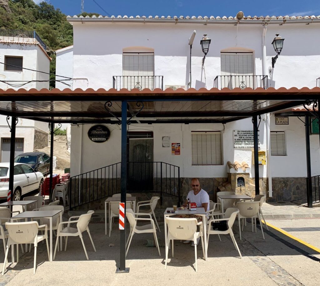 We rijden het dorpje in en zien direct de cameraploeg die Juani op het terras aan het filmen is. Er zitten een paar Nederlandse toeristen. In de besloten Facebookgroep had ik inmiddels al vernomen dat Juani in de bediening werkt in dat café bij binnenkomst van het dorpje. Maar nu weten we dat zogenaamd nog niet, want het is nog niet uitgezonden.