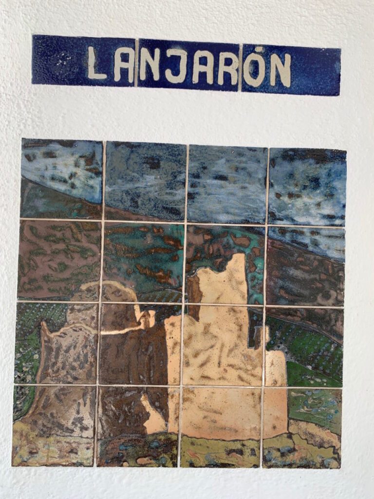 We lazen dat Órgiva een leuk kunstenaarsdorp is, dus besloten er te lunchen. Maar dat viel tegen. We kwamen er tijdens siësta en nu weet ik dat geen een Spaans dorp er aantrekkelijk uitziet tijdens siësta, vanwege alle dichte rolluiken en geen mens op straat. Maar Órgiva was smoezelig, veel zwervers en er hing een onvriendelijke sfeer. Wat ze wel leuk hebben gedaan op het plein, is een tegeltjes-kunstwerk van alle plaatsjes in Las Alpujarras.